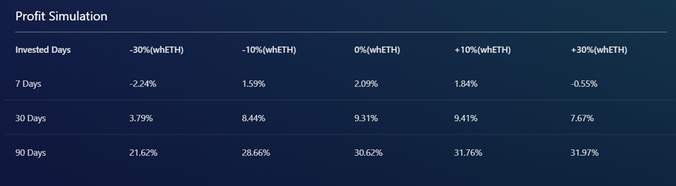 Aşağıdaki grafikte yatay eksen $whETH fiyat hareketini, dikey eksen pozisyonun kar/zararını (%) göstermektedir. Kar dinamiklerini daha iyi anlamak için simülatöre deneysel sayılar girebilirsiniz.