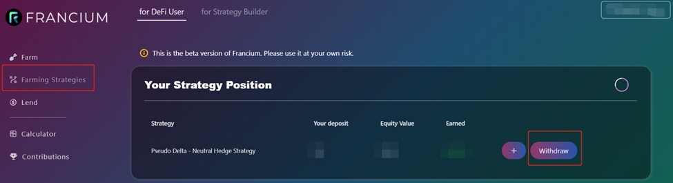 Yatırım yaptıktan sonra, pozisyonunuzu kontrol etmek veya varlığı geri çekmek için “Farming Strategies” sayfasına dönebilirsiniz.